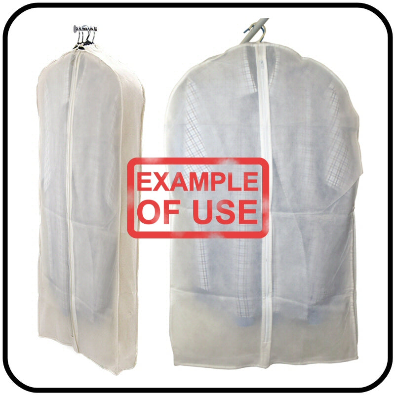 Reuseable, Washable, zip-up garment bag. For hanging suit length items such as Shirts, Polo’s, T-shirts and Pants.