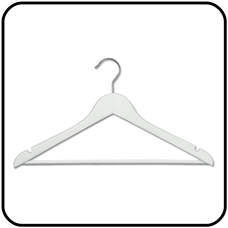 White wooden hangers work well as an all-purpose hanger and are generally used for shirts, blouses and trousers.